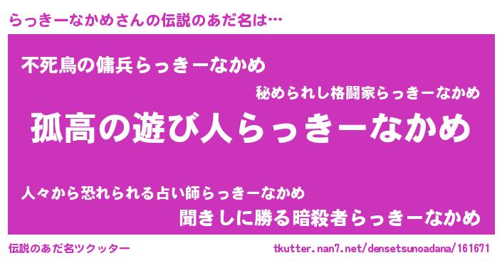 | 男性向けラノベタイトル風あだ名 | 『魔法科高校のらっきーなかめ』 |