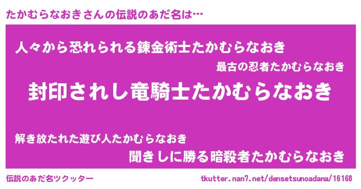 | 男性向けラノベタイトル風あだ名 | 『たかむらなおきに滅ぼされるだけの簡単なお仕事です』 |