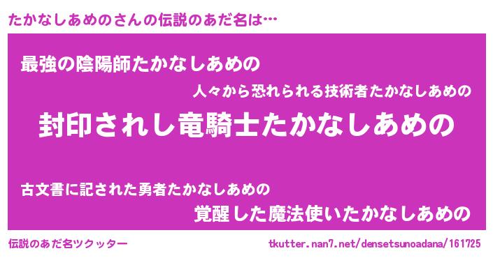 | 胡散臭い通販商品みたいなあだ名 | 『億万長者になれるブレスレット…その名も「たかなしあめの」』 |