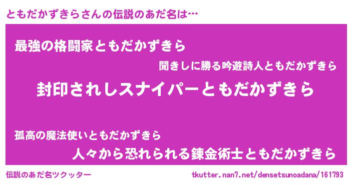 | 胡散臭い通販商品みたいなあだ名 | 『億万長者になれる霊験あらたかなお札…その名も「ともだかずきら」』 |