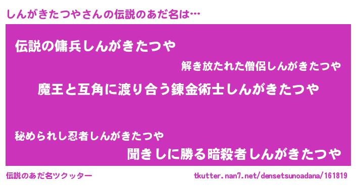 | ヒーロー風カッコイイあだ名 | 『慈愛の使者しんがきたつや』 |