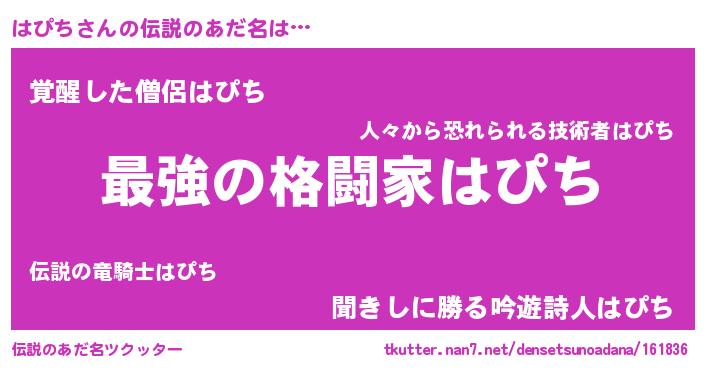 | 胡散臭い通販商品みたいなあだ名 | 『あなたにだけ特別に提供する100年もののヴィンテージワイン…その名も「はぴち」』 |