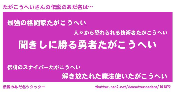 | 男性向けラノベタイトル風あだ名 | 『たがこうへいという概念が存在しない退屈な世界 』 |