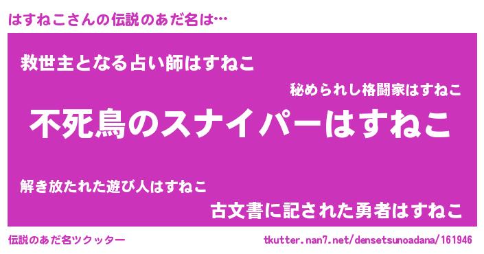| 男性向けラノベタイトル風あだ名 | 『Re:はすねこから始める異世界生活』 |