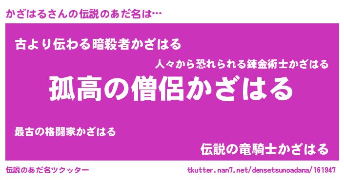 | ヒーロー風カッコイイあだ名 | 『黄金騎士カザ』『最強戦士カザハル』 |