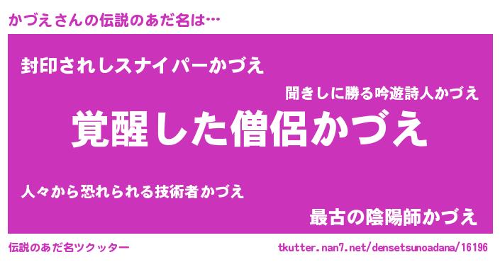 | 男性向けラノベタイトル風あだ名 | 『かづえの嫁は女の子じゃないと思った?』 |