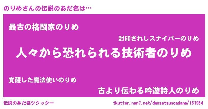 | 女子向けラノベタイトル風あだ名 | 『のりめ夫妻のなれそめ』『闇ののりめ』 |