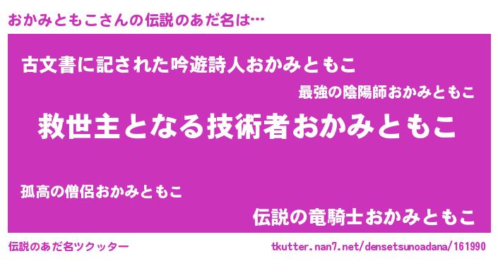 | ヘコむあだ名 | 『おかみともこ(小並感)』『おかふぇ~』 |