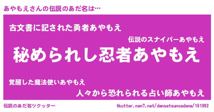 | ヒーロー風カッコイイあだ名 | 『仮面アヤダー』『ウルトラあやもえマン』 |