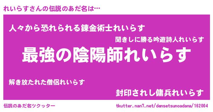 | 男性向けラノベタイトル風あだ名 | 『れいらす~年齢イコール彼女いない歴の魔法使い~』 |