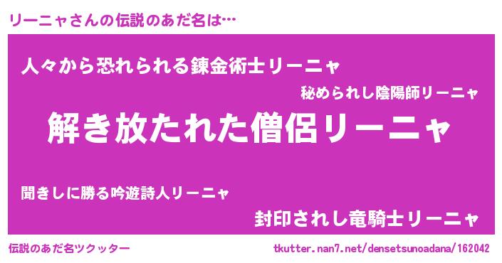 | 男性向けラノベタイトル風あだ名 | 『リーニャの嫁は女の子じゃないと思った?』 |