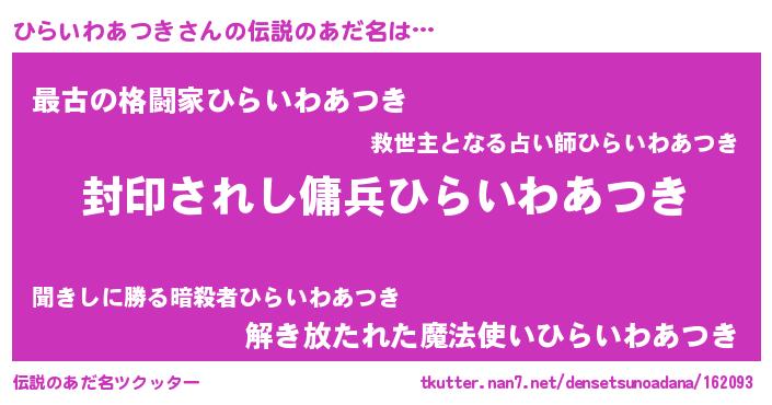 | 男性向けラノベタイトル風あだ名 | 『うちのひらいわあつきが世界を掌握している!』 |