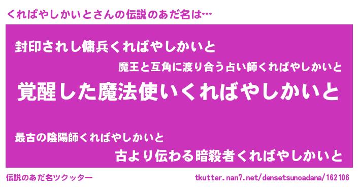 | 男性向けラノベタイトル風あだ名 | 『くればやしかいとの嫁は女の子じゃないと思った?』 |
