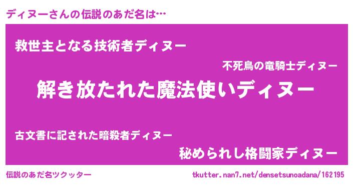 | 男性向けラノベタイトル風あだ名 | 『ダンジョンにディヌーを求めるのは間違っているだろうか』 |