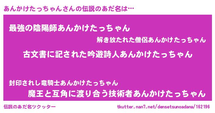 | 女子向けラノベタイトル風あだ名 | 『悪役あんかけたっちゃんに転生したようですが、知った事ではありません』 |