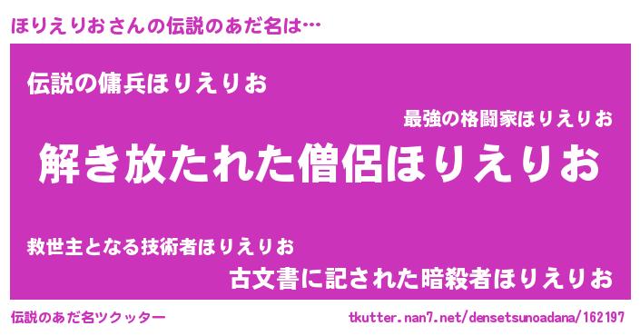| 男性向けラノベタイトル風あだ名 | 『ほりえりおの嫁は女の子じゃないと思った?』 |