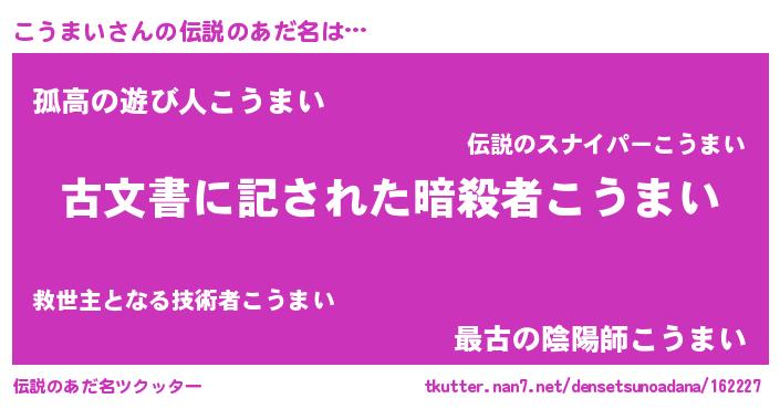 | 男性向けラノベタイトル風あだ名 | 『こうまいに滅ぼされるだけの簡単なお仕事です』 |