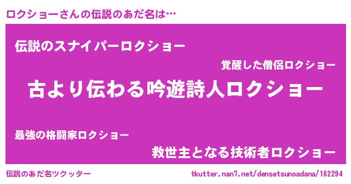 | 男性向けラノベタイトル風あだ名 | 『魔弾の王とロクショー』 |