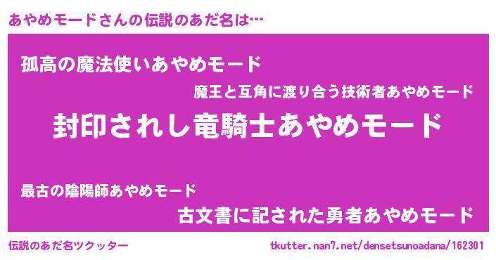 | 胡散臭い通販商品みたいなあだ名 | 『億万長者になれるブレスレット…その名も「あやめモード」』 |