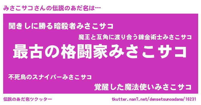| 肩書あだ名 | 『みさこサコ中佐』『みさこサコ総理大臣』 |