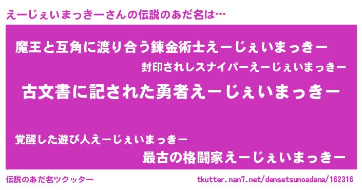 | 意味不明あだ名 | 『永久保存えーじぇいまっきー』 |