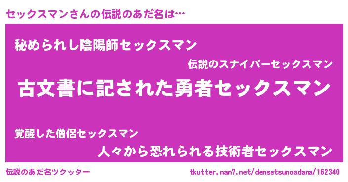 | 男性向けラノベタイトル風あだ名 | 『うちのセックスマンが世界を掌握している!』 |