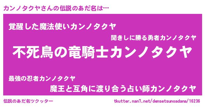| 女子向けラノベタイトル風あだ名 | 『カンノタクヤ姫と円卓の騎士』 |