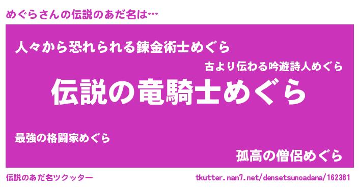 | 男性向けラノベタイトル風あだ名 | 『めぐらの憂鬱』『魔弾の王とめぐら』 |