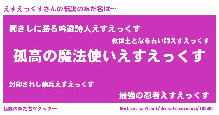| 胡散臭い通販商品みたいなあだ名 | 『信頼と実績のサプリメント…その名も「えすえっくす」』 |