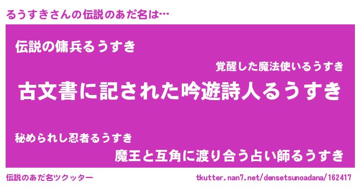 | 男性向けラノベタイトル風あだ名 | 『るうすきに滅ぼされるだけの簡単なお仕事です』 |