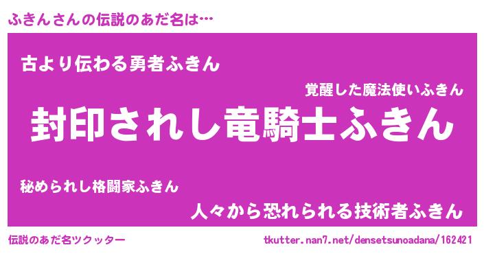 | 男性向けラノベタイトル風あだ名 | 『ふきん~年齢イコール彼女いない歴の魔法使い~』 |