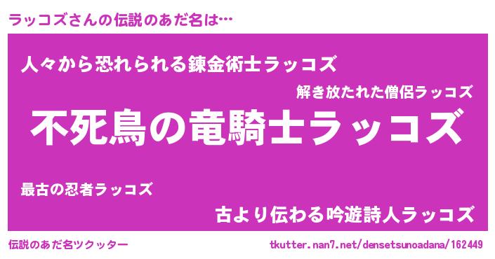| 女子向けラノベタイトル風あだ名 | 『ラッコズ姫と円卓の騎士』 |