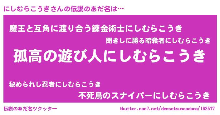 | 意味不明あだ名 | 『とにかく怪しいにしむらこうき』 |