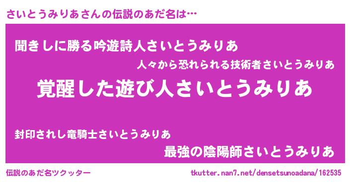 | ポケモン風あだ名 | 『サイゴンZ』『ヒサイトウミリア』 |