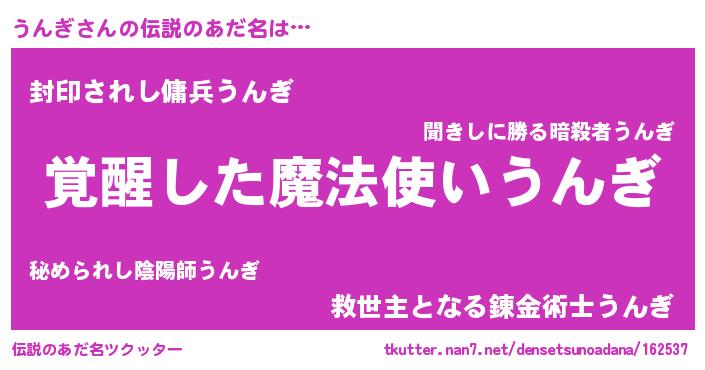 | 男性向けラノベタイトル風あだ名 | 『うんぎの嫁は女の子じゃないと思った?』 |