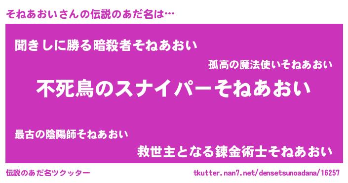 | 男性向けラノベタイトル風あだ名 | 『そねあおいに滅ぼされるだけの簡単なお仕事です』 |