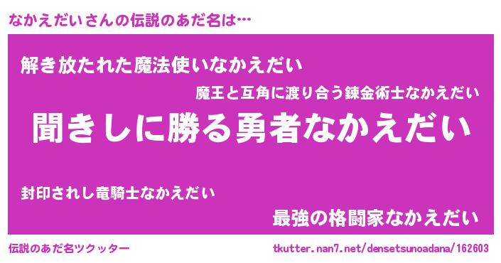 | 男性向けラノベタイトル風あだ名 | 『なかえだいという概念が存在しない退屈な世界 』 |