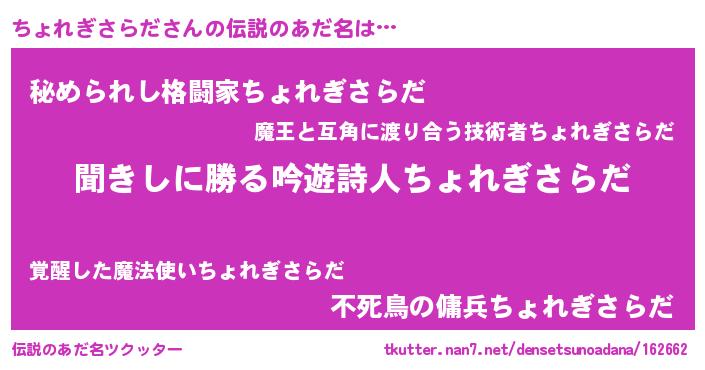 | 女子向けラノベタイトル風あだ名 | 『異世界で失敗しない100のちょれぎさらだ』 |