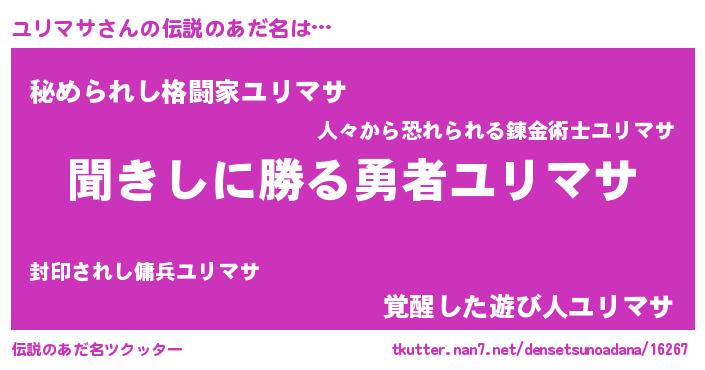 | ヒーロー風カッコイイあだ名 | 『ネオユリマサ』『ウルトラユリマサマン』 |