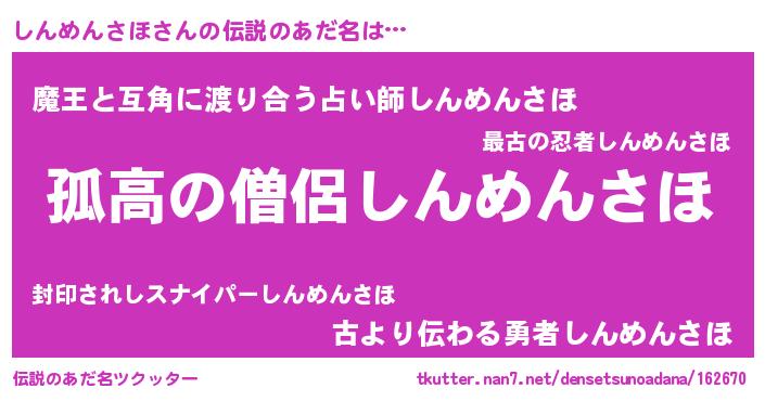 | ヒーロー風カッコイイあだ名 | 『黄金騎士シン』『愛の使者しんめんさほ』 |