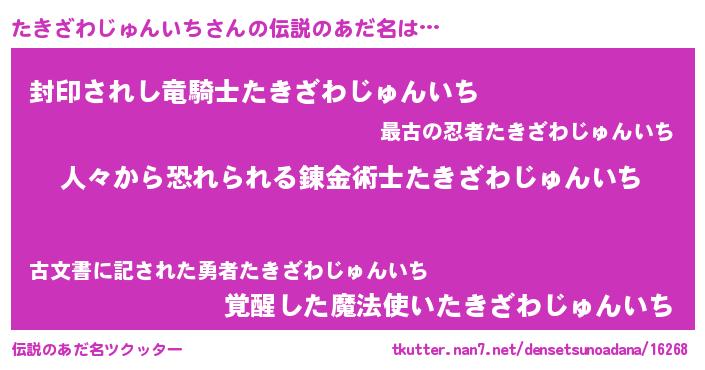 | 男性向けラノベタイトル風あだ名 | 『おまえをオタクにしてやるから、俺をたきざわじゅんいちにしてくれ! 』 |