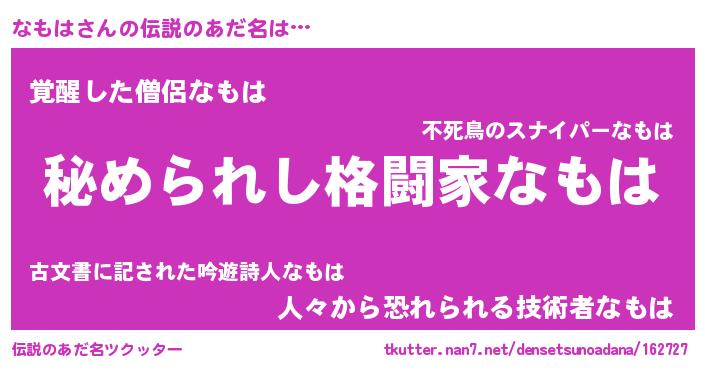 | 男性向けラノベタイトル風あだ名 | 『ナモハスレイヤー』『魔弾の王となもは』 |