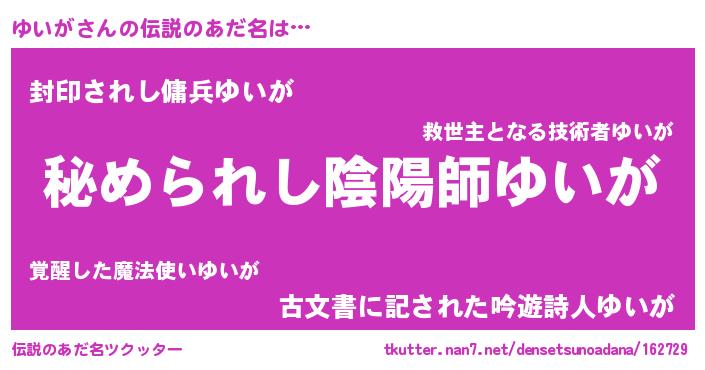 | ファンタジー風あだ名 | 『エターナルユイガー』『ユイフェル』 |