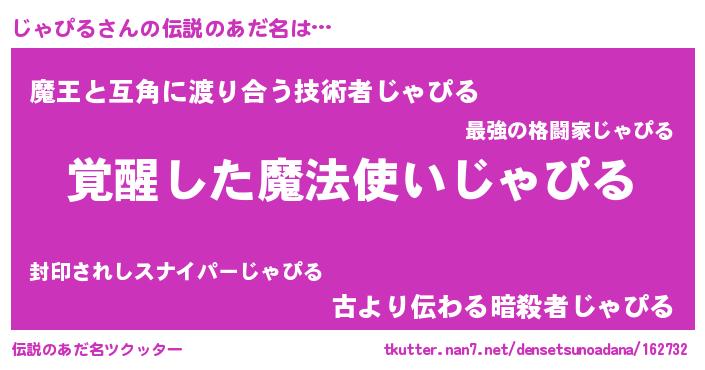 | 男性向けラノベタイトル風あだ名 | 『じゃぴるの嫁は女の子じゃないと思った?』 |