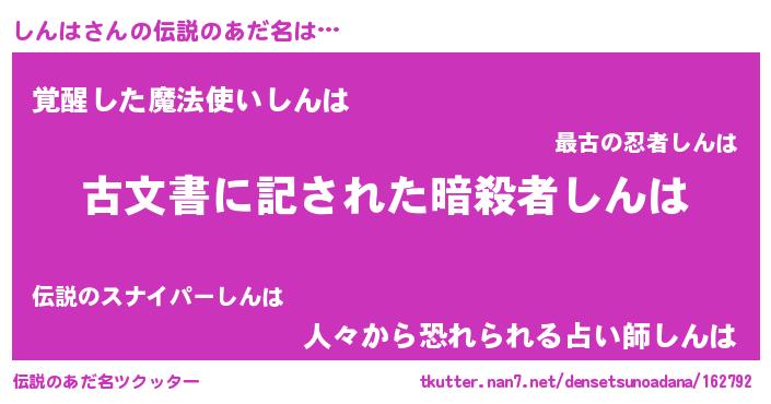 | 男性向けラノベタイトル風あだ名 | 『しんは~年齢イコール彼女いない歴の魔法使い~』 |