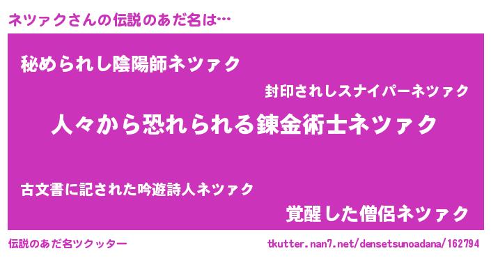 | 意味不明あだ名 | 『住所不定無職ネツァク(77歳)』 |