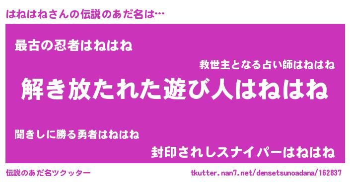 | ヒーロー風カッコイイあだ名 | 『銀牙騎士ハネ』『ウルトラはねはねマン』 |
