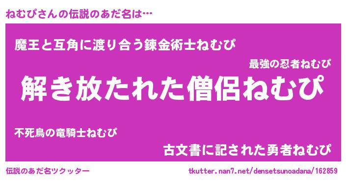 | ヒーロー風カッコイイあだ名 | 『魔戒騎士ネム』『友情の使者ねむぴ』 |