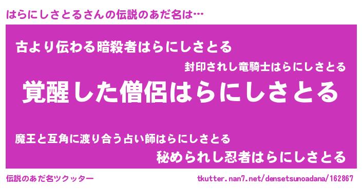 | 男性向けラノベタイトル風あだ名 | 『はらにしさとるの嫁は女の子じゃないと思った?』 |