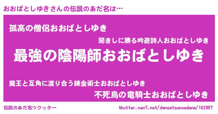 | 男性向けラノベタイトル風あだ名 | 『おおばとしゆき~年齢イコール彼女いない歴の魔法使い~』 |